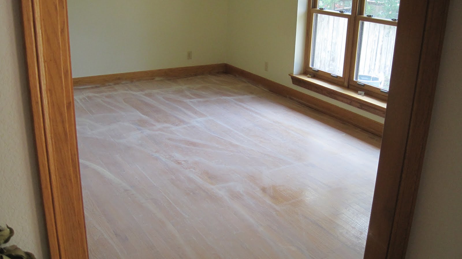 Tuesday morning, I went over the rooms with a rag and paint thinner, to get up all and any dirt and dust. Then I coated it with polyurethane. I did the baseboards first, with a brush, and then the floor itself with a lambs wool